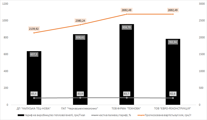Enterprises that plan to produce more electricity in relation to planned volumes of heat energy: Kalush CHPP has the cogeneration of 918 MWh per gigacalorie of heat energy, PJSC Cherkaske Khimvolokno (Cherkasy CHPP) – 949 MWh per Gkal., TEHNOVA FIRM LLC (Chernihiv CHPP) – 1,760 MWh per Gkal, LLC Energia – Novyi Rozdil – 1,336 MWh per Gkal.