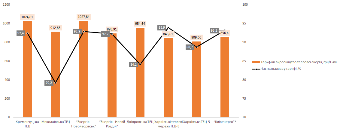 In 2018, the costs of conditional fuel for the production of heat by CHPP were approved: from the smallest – 139 kg of conditional fuel per gigacalorie (kg c.f./Gcal) (PJSC Mykolayivska CHPP) and to the largest one – 223.3 kg c.f. / Gkal (PJSC DTEK Donetskoblenergo PE Myronivska TPP). Pay attention to the difference.